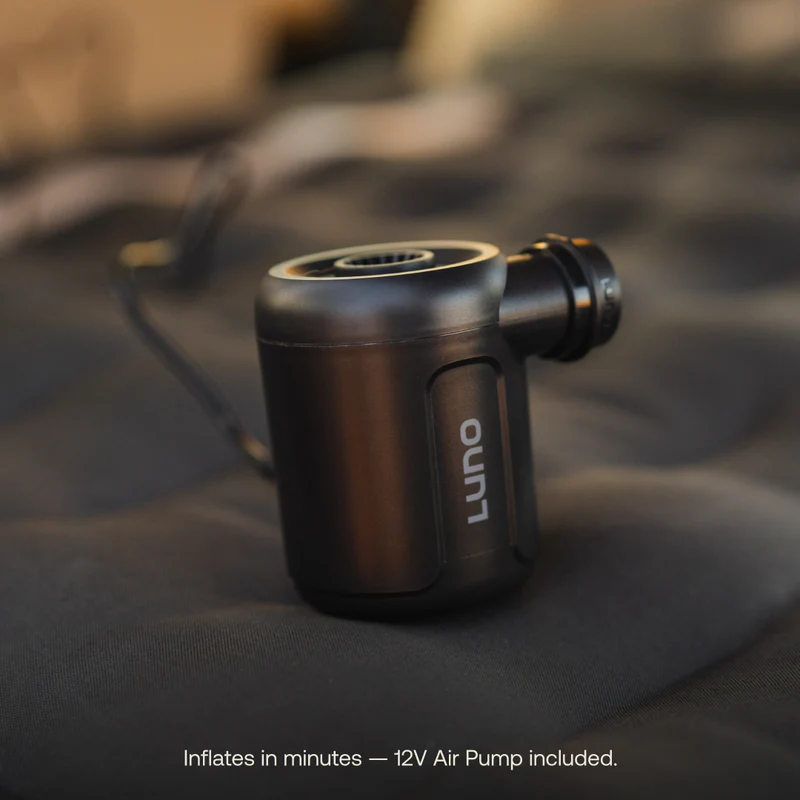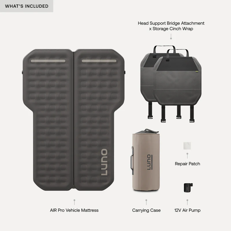 The Luno AIR Pro Vehicle Mattress is engineered for durable, vehicle-specific camping, featuring heavy-duty 300D Oxford fabric to prevent punctures from pets and gear. Key innovations include a dual-chamber design for customized firmness, a "Solo Zipper" for modular use, and patented head support bridges that fill gaps, enhancing comfort and expanding usable sleeping length.